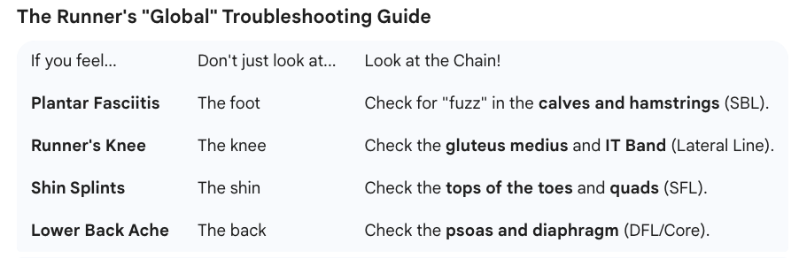 For a runner, anatomy chains are the difference between “plodding” (using muscle power to fight gravity) and “gliding” (using fascial elasticity to bounce off the ground).